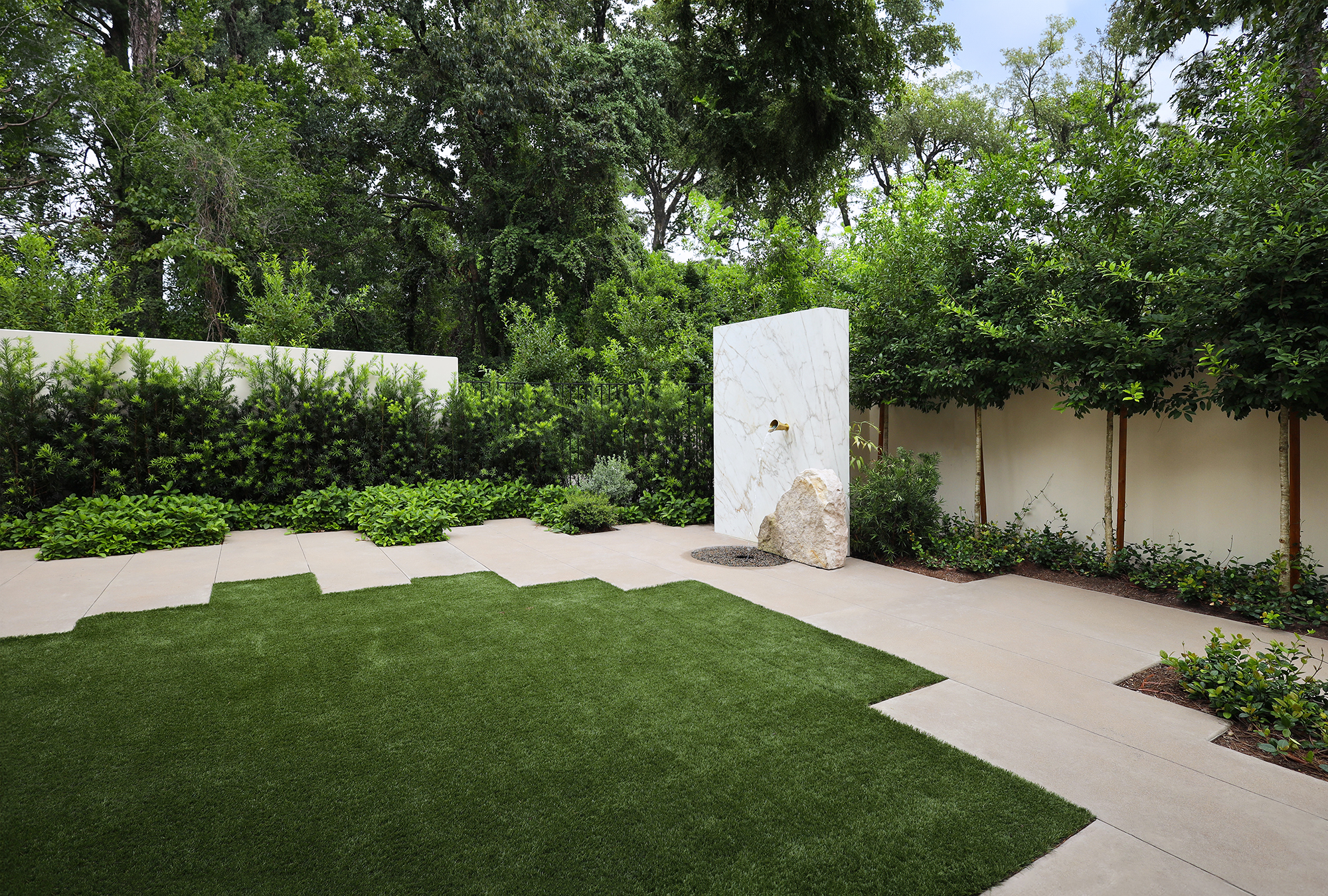 Natural turf options are selected for sun/shade conditions, soil health, and long-term maintenance requirements. Artificial turf is a good option for spaces that get heavy use or limited sun, and can also be used to create clean lines and low-maintenance green areas for dogs, kids, and gatherings.